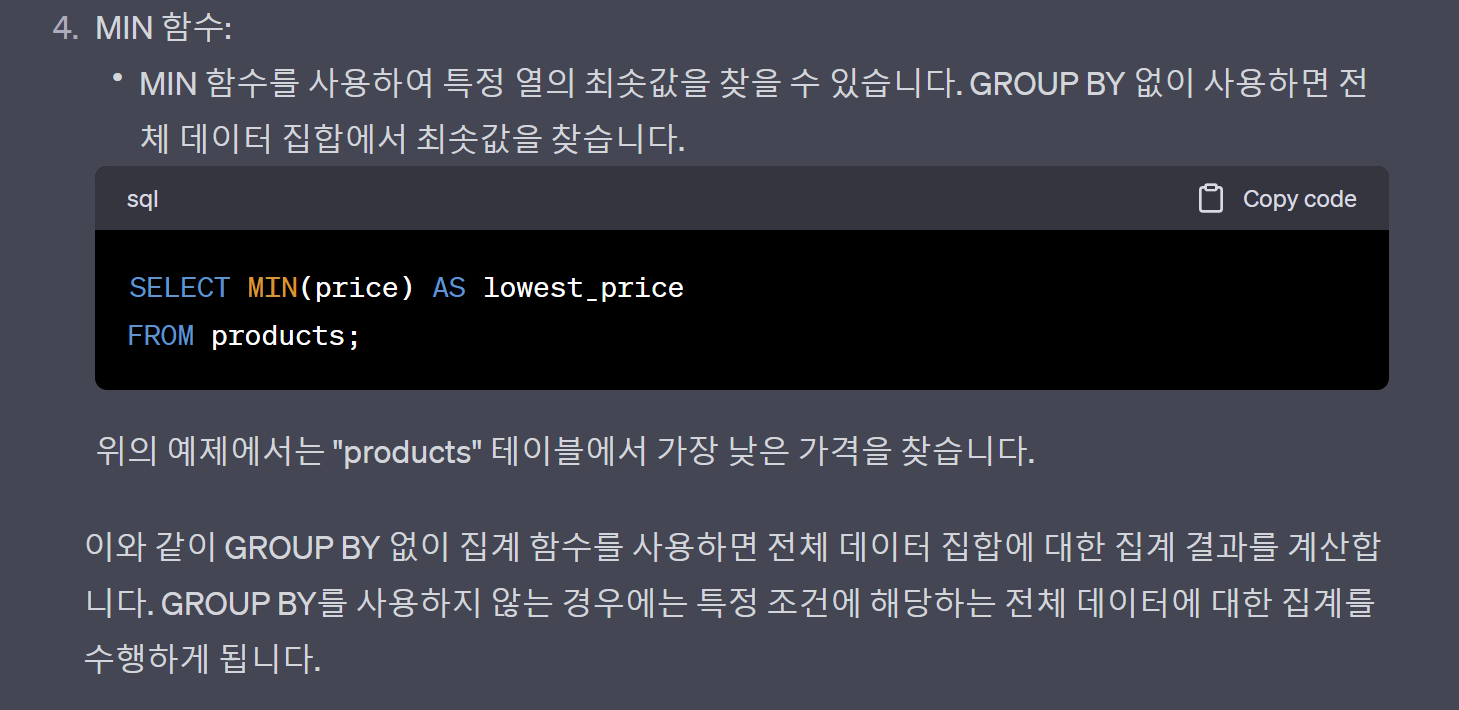 그러나 모든 집계 함수에 대해 GROUP BY를 사용할 필요는 없으며, 전체 데이터 집합에 대한 집계를 계산할 때는 GROUP BY를 사용하지 않을 수 있다.
