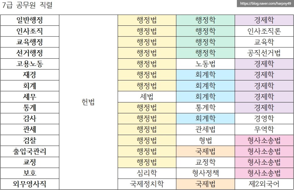 국가직 7급 공무원에 대해서 알아보다가 생각보다 다양한 직렬이 있길래 직렬별 선택 과목을 보기 좋게 정리했다. 겹치는 과목은 같은 색으로 묶었다.