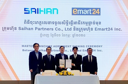 | 본문 | 이마트24가 오는 6월 캄보디아에 국내 편의점업체로는 처음으로 점포를 연다. 이마트24는 지난 1일 프놈펜의 한 호텔에서 캄보디아 진출 기념행사를 열고 비전과 계획을 발표했다고 2일 밝혔다. 지난해 12월엔 서울 성수동 본사에서 캄보디아 현지 합작법인 사이한파트너스와 마스터프랜차이즈 계약을 맺었다. 사이한파트너스는 캄보디아 현지 유통업체 사이손브러더홀딩과 한립건축그룹 간 합작법인이다. 마스터프랜차이즈 계약에 따라 사이한파트너스는 이마트24로부터 캄보디아 가맹사업 운영권을 받아 입지 선정, 상품 조달 등을 맡는다. |