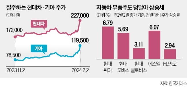 | 본문 | 현대차·기아가 3일 만에 약 20% 급등하며 나란히 질주하고 있다. 지난해 나란히 사상 최대 실적을 낸 데다 주가 저평가 매력까지 부각되면서 투자 심리에 불이 붙었다는 분석이 나온다. 완성차 업체에서 시작된 열기는 자동차 부품주로까지 확산하는 분위기다. ○ 사상 최대 실적에도 저평가 현대차는 2일 유가증권시장에서 9.13% 오른 22만7000원에 장을 마쳤다. 기아도 12.42% 급등했다. 장 초반 나란히 52주 신고가를 경신한 현대차와 기아는 2021년 이후 약 3년 만에 최대 상승폭을 기록했다. 외국인과 기관이 모두 ‘사자’에 나서며 주가 상승을 견인했다. 기관과 외국인은 이날 현대차 주식을 각각 414억원, 5549억원어치 순매수했다. 외국인은 기아도 2707억원어치 사들였다. 현대차의 최근 3거래일간 상승폭은 19.47%에 달한다. 밸류에이션(실적 대비 주가 수준) 매력이 크게 부각됐다는 분석이다. 정부가 ‘코리아 디스카운트' 해소를 위해 ‘기업 밸류업 프로그램’을 도입할 것으로 알려지자 자동차주가 대표적인 저평가 업종으로 떠올랐다. 현대차와 기아는 주가순자산비율(PBR) 1배 미만의 대표적인 ‘저PBR주’다. 에프앤가이드가 집계한 현대차와 기아의 올해 실적 추정치 기준 PBR은 각각 0.54배, 0.78배 수준이다. 노동길 신한투자증권 연구원은 “자동차 업종은 코로나19 이후 성장주 위주로 시장이 재편되는 과정에서 소외됐다”며 “적정 가치로만 회귀해도 두 자릿수 이상의 상승 여력을 갖고 있다”고 말했다. 사상 최대 실적도 주가 상승을 뒷받침하고 있다. 현대차는 지난해 처음으로 연간 영업이익 15조원을 넘어섰다. 기아차도 영업이익 11조6078억원을 기록했다. 종전 최대 실적인 2022년보다 60.48% 많았다. 현대차·기아는 배당과 자사주 매입·소각 등의 방식으로 5조원 이상을 주주에게 돌려주는 강력한 주주환원책을 제시하며 주가 상승에 힘을 보탰다. ○ 부품주도 주가 시동