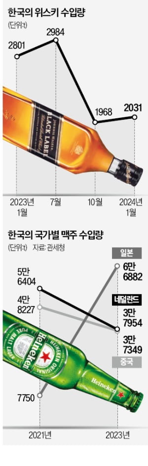 | 본문 | 최근 수요 부진을 겪는 위스키, 맥주 수입업체에 인력 감축 찬바람이 불고 있다. 업계 선두를 달리는 디아지오코리아와 하이네켄코리아가 업황 부진과 실적 악화를 이유로 인력 구조조정에 들어갔다. 주류업계에서는 위스키 열풍이 꺾이고 수입 맥주 소비량도 갈수록 줄어 ‘몸집 줄이기’에 나서는 수입업체가 더 있을 것이라는 관측이 나온다. 19일 주류업계에 따르면 네덜란드산 맥주 하이네켄을 수입하는 하이네켄코리아는 최근 전체 직원의 3~4%를 감원하는 구조조정을 결정했다. 하이네켄코리아 관계자는 “주류 소비자의 변화하는 소비 패턴에 발 빠르게 대처하고 경쟁력을 향상하기 위해 조직 개편을 진행하고 있다”고 말했다. 국내 맥주 소비가 전반적으로 감소세를 보이는 상황에서 일본산 맥주의 거센 공세로 시장점유율까지 하락하자 인력 감축에 나선 것으로 풀이된다. 이에 앞서 칭다오 맥주 수입사인 비어케이도 작년 11월 희망퇴직을 받았다. 국내 맥주 수입량은 몇 년째 줄고 있다. 관세청에 따르면 2018년 38만7981t이던 맥주 수입량은 매년 감소해 2022년 22만8747t이 됐다. 4년 새 40% 넘게 줄었다. 작년 맥주 수입량은 23만8695t이었다. 업계 관계자는 “작년 맥주 수입량이 2022년보다 늘긴 했지만 2022년 수입량이 역대 최저였던 것을 감안하면 유의미한 반등이라고 보기 어렵다”고 했다. 하이네켄을 앞세운 네덜란드산 맥주는 2021년까지 수입 맥주 점유율 1위를 기록했다. 하지만 지난해 ‘아사히 슈퍼드라이 생맥주캔’ 등 일본산 수입이 급증하면서 2위로 내려앉았다. 소매점 매출 점유율에서도 하이네켄은 2022년까지 1위를 차지하다가 지난해 아사히와 칭다오에 밀려 3위를 기록했다. 저무는 위스키 시대