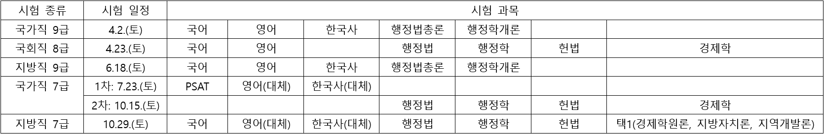 국어, 영어, 한국사, 행정법총론, 행정학개론(지방행정 포함)
