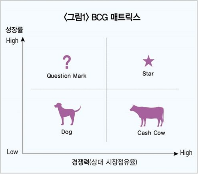 - 성장기 후반~쇠퇴기: Cash Cow(수익주종사업)