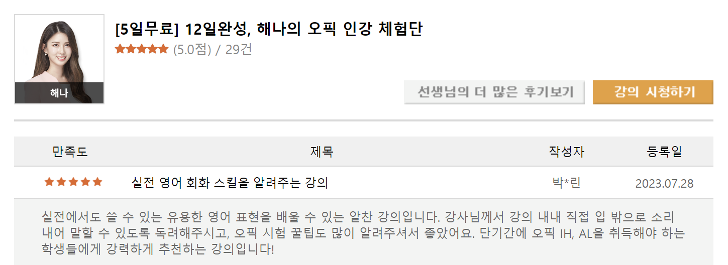 ”2주만에 IM1 → IH! ” 수강생 만족도 100% 해나 선생님의 오픽 집중관리반!